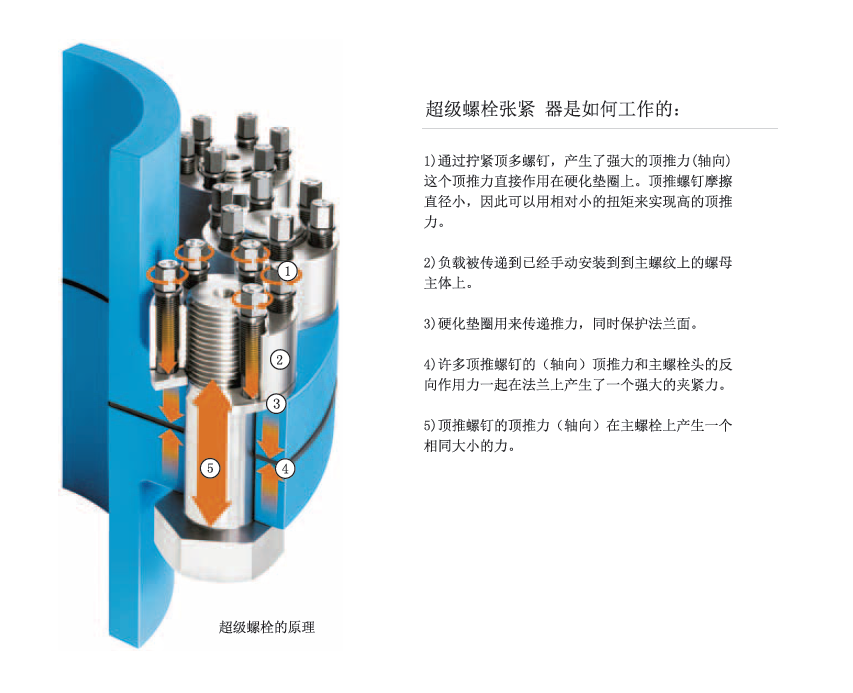 超級螺栓張緊器被設(shè)計(jì)來直接取代傳統(tǒng)的螺母和螺栓。這些裝置可以旋合于一個(gè)新的或者現(xiàn)有的螺栓,螺柱,螺桿或者軸上。主螺紋用于安置緊張器在螺栓或者螺柱上并靠在硬化墊圈及承載面上,一旦安置到位,螺栓或者螺柱的實(shí)際的張緊通過簡單的手動(dòng)工具來擰緊環(huán)繞主螺紋一圈的頂推螺釘來實(shí)現(xiàn)。頂推螺釘均勻地傳遞預(yù)緊力到主螺紋上,從而,也傳遞到連接件上。主螺紋被純張力鎖緊。